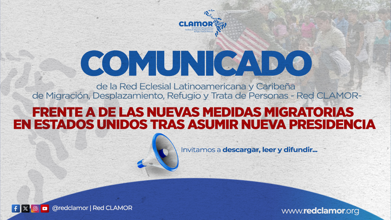 La Red CLAMOR se pronuncia ante las recientes medidas migratorias implementadas en Estados Unidos, con el objetivo de enfatizar la importancia de defender los derechos de las personas en contexto de movilidad. Ante esta situación, la CLAMOR hace un llamado urgente a la comunidad internacional, a las organizaciones basadas en la fe, a los gobiernos y a la sociedad civil a «unirse en la creación de puentes de diálogo para proteger y promover los derechos fundamentales de las personas migrantes».